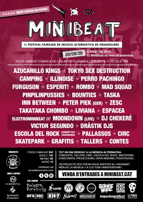 Sabent la nova data al calendari, ja estem parlant amb totes les bandes, espectacles, tallers i persones implicades en l’edició d’enguany per mirar de confirmar que els vagi bé el canvi de dia i mirar de què es produeixi la mínima variació possible. Els que ja tingueu l’entrada, us servirà per a la nova data del 20 de setembre, i als que no us vagi bé, us retornarem l’import. En aquest cas, ompliu el formulari “Contacte” que trobareu a la web del MiniBeat amb les vostres dades i us gestionarem el retorn de l’import de l’entrada.