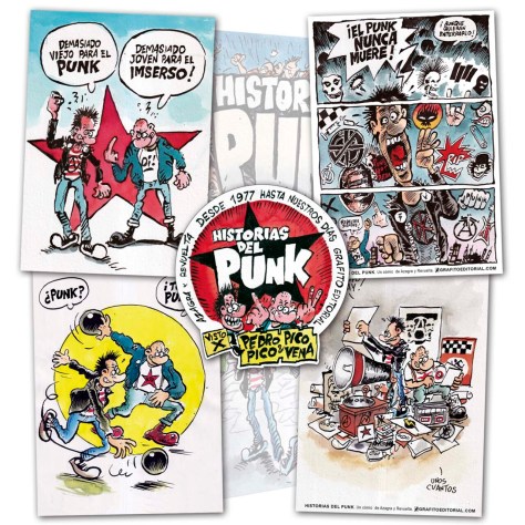 HISTORIAS DEL PUNK és un homenatge a tots els grups, als primers concerts, als locals, la lluita per defensar aquests espais, i a la contrainformació. Un repàs a les ràdios lliures, l’antimilitarisme, el respecte a ser diferent i la diversitat d’estils. No és un tractat amb dates i evolucions, sinó un còmic sobre una cosa que va passar i que encara passa. Molts dels que van començar amb el Punk van acabar en altres corrents com el Heavy, el Trash, el Rock Urbà, el Power-Pop o ves-te’n a saber què… però queda en tots una cosa que es va anomenar l’actitud, la postura vital davant la vida i contra els que controlen el cotarro. Aquesta és la idea, una mirada enrere amb sentit de l’humor, dedicat sobretot a aquells que no van viure aquelles mogudes. AZAGRA i REVUELTA.